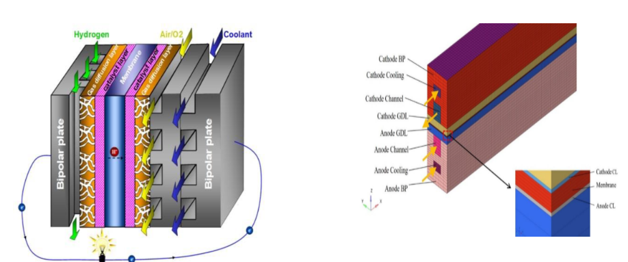 图1 PEMFC 工作原理示意图 图2 单流道PEMFC模型示意图