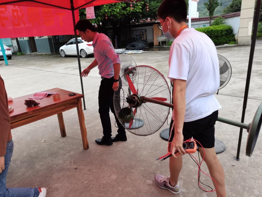 此次活动主要包括检测维修村民送来的家电和进村向村民宣传家庭用电常识,检查家里插座插排,提醒安全用电,防范火灾。