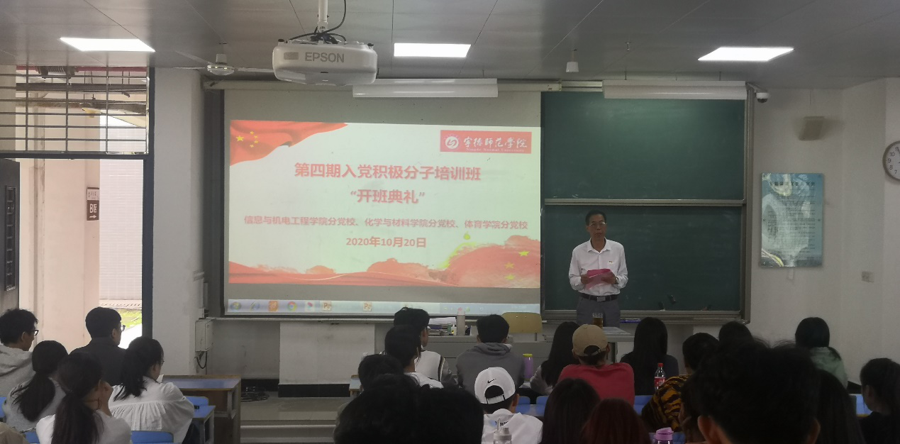 2020年10月20日下午,由365英国官网登录入口党校信息与365英国官网登录入口分党校、化学与材料学院分党校、体育学院分党校联合举办的第四期入党积极分子培训班在求是楼DB101教室正式开班。参加此次开班仪式的有信息与365英国官网登录入口党委书记陈茂和及本期92名入党积极分子。陈茂和为全体学员作开班动员讲话并上党课——《中国共产党章程》。
